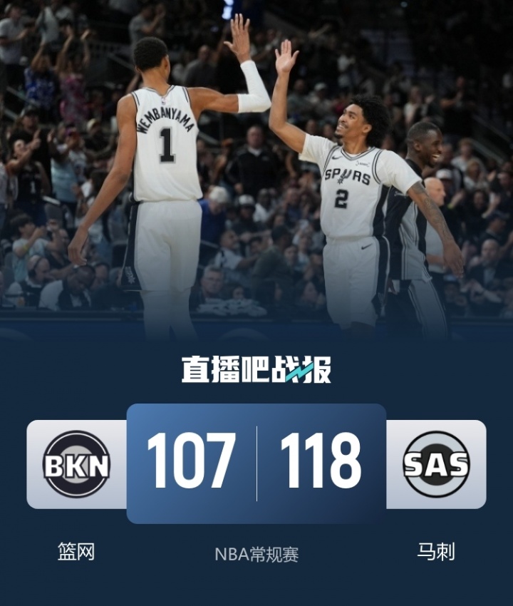 上半场,托马斯攻高效发挥,率队占据场上主动,凯尔登连投带罚缩小分差,马刺持续发力反超比分,文班亚马攻防两端建功,次节马刺逐渐将分差拉开到两位数,托马斯连投带罚努力追赶,但哈珀和文班亚马联手统治攻防,率队一举将优势扩大到20分以上,半场战罢马刺69-48领先篮网。下半场,马刺命中率下降,托马斯单节内外开花再拿14分带队迫近比分,末节篮网飙中4记三分迅速反超,此后双方争夺陷入白热化,比分交替领先,关键时刻马刺攻防两端发力一举获得8分优势,篮网苦苦追赶无果。最终,马刺118-107力克篮网,主场过关。